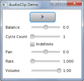 AudioClip audioclip = null; URL source = getClass().getResource("audio/Windows.wav"); audioclip = AudioClipBuilder.create() .source(source.toString()) .balance(0.0) .cycleCount(1) .pan(0.0) .rate(1.0) .volume(1.0) .build(); |