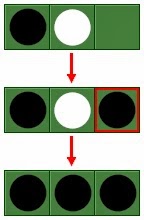 其規則是每下一棋子必須將對方的棋子包圍,而被包圍的棋子則調換成玩家己方的棋子,此動作稱為Flip,如下圖所示,一列中原僅有黑白各一棋子,當玩家於白棋右方下一黑棋時,兩黑棋由於包圍住白棋,符合遊戲規則,因此玩家可將對方的白棋移除,換成玩家的黑棋: