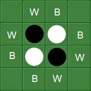 除了加權比重之外,由於可在遊戲時,任選黑白一方為玩家的棋子顏色,因此在遊戲之初,必須依玩家所下的第一顆棋子位置決定雙方棋子顏色,黑白雙方在遊戲開始時,所有可能下的位置,如下圖所示,其中B代表黑棋、W代表白棋:
