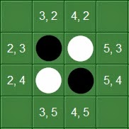 若以二維陣列而言,假設分別以gridx與gridy代表水平與垂直位置,則分別由0到7,例如左上角的位置為 (0, 0)、右下角為 (7, 7),因此上圖的可能位置則分別依序如下圖所示,依此可決定雙方棋子的顏色: