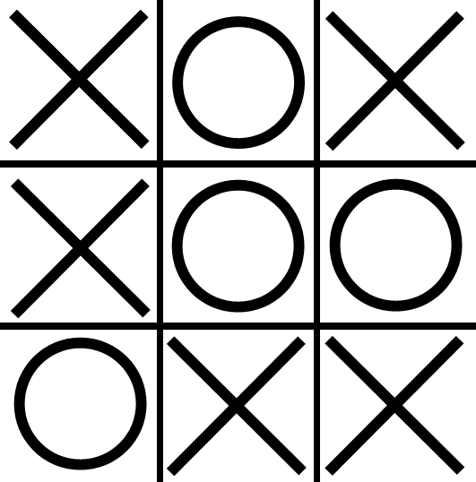 井字遊戲 (Tic Tac Toe) 又稱為井字棋或圈圈叉叉,是我們從小玩到大的益智遊戲,兩個人隨時只要有紙和筆,就可以開始遊戲,其中一方打圈、一方打叉,輪流在3×3的格子上畫上圈叉,最先將三個圈或三個叉連成一線者則獲勝,連線可為橫線、直線或斜線,若格子填滿後仍無任何一方連成一線,則為平手,如下圖所示: