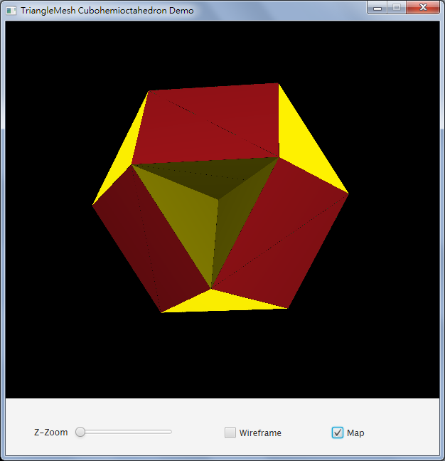float C0 = length * (float) Math.sqrt(2.0) / 2.0f; // 建立TriangleMesh TriangleMesh trianglemesh = new TriangleMesh(); // 設定頂點座標 trianglemesh.getPoints().addAll( C0, 0.0f, C0, C0, 0.0f, -C0, -C0, 0.0f, C0, -C0, 0.0f, -C0, C0, C0, 0.0f, C0, -C0, 0.0f, -C0, C0, 0.0f, -C0, -C0, 0.0f, 0.0f, C0, C0, 0.0f, C0, -C0, 0.0f, -C0, C0, 0.0f, -C0, -C0 ); // 設定貼圖座標 trianglemesh.getTexCoords().addAll( 0.50f, 1.0f, 0.75f, (float) (1.0-Math.sqrt(3.0)/4.0f), 0.25f, (float) (1.0-Math.sqrt(3.0)/4.0f), 1.00f, 1.0f, 0.50f, (float) (1.0-Math.sqrt(3.0)/2.0f), 0.00f, 1.0f ); // 設定各三角形的面 trianglemesh.getFaces().addAll( 0, 2, 4, 1, 9, 4, 0, 2, 9, 1, 4, 4, 0, 2, 9, 1, 3, 4, 0, 2, 3, 1, 9, 4, 0, 2, 3, 1, 7, 4, 0, 2, 7, 1, 3, 4, 0, 2, 7, 1, 10, 4, 0, 2, 10, 1, 7, 4, 0, 2, 5, 1, 11, 4, 0, 2, 11, 1, 5, 4, 0, 2, 11, 1, 3, 4, 0, 2, 3, 1, 11, 4, 0, 2, 3, 1, 6, 4, 0, 2, 6, 1, 3, 4, 0, 2, 6, 1, 8, 4, 0, 2, 8, 1, 6, 4, 1, 2, 4, 1, 8, 4, 1, 2, 8, 1, 4, 4, 1, 2, 8, 1, 2, 4, 1, 2, 2, 1, 8, 4, 1, 2, 2, 1, 7, 4, 1, 2, 7, 1, 2, 4, 1, 2, 7, 1, 11, 4, 1, 2, 11, 1, 7, 4, 1, 2, 5, 1, 10, 4, 1, 2, 10, 1, 5, 4, 1, 2, 10, 1, 2, 4, 1, 2, 2, 1, 10, 4, 1, 2, 2, 1, 6, 4, 1, 2, 6, 1, 2, 4, 1, 2, 6, 1, 9, 4, 1, 2, 9, 1, 6, 4, 0, 0, 5, 1, 1, 2, 0, 0, 1, 1, 4, 2, 0, 0, 8, 1, 2, 2, 0, 0, 2, 1, 10, 2, 7, 0, 2, 1, 6, 2, 7, 0, 6, 1, 3, 2, 7, 0, 11, 1, 5, 2, 7, 0, 5, 1, 10, 2, 9, 0, 1, 1, 11, 2, 9, 0, 11, 1, 3, 2, 9, 0, 6, 1, 8, 2, 9, 0, 8, 1, 4, 2 ); // 設定各面的平滑參數 trianglemesh.getFaceSmoothingGroups().addAll( 0, 0, 0, 0, 0, 0, 0, 0, 0, 0, 0, 0, 0, 0, 0, 0, 0, 0, 0, 0, 0, 0, 0, 0, 0, 0, 0, 0, 0, 0, 0, 0, 0, 0, 0, 0, 0, 0, 0, 0, 0, 0, 0, 0 ); // 建立MeshView MeshView meshview; meshview = new MeshView(createMesh(150)); ...【參考資料】
