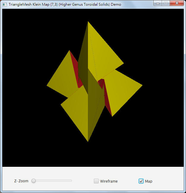 float C0 = length * 57.0f; float C1 = length * 141.0f; float C2 = length * 209.0f; float C3 = length * 342.0f; float C4 = length * 513.0f; float C5 = length * 549.0f; float C6 = length * 855.0f; float C7 = length * 1539.0f; float C8 = length * 2337.0f; // 建立TriangleMesh TriangleMesh trianglemesh = new TriangleMesh(); // 設定頂點座標 trianglemesh.getPoints().addAll( C4, -C4, C8, C4, C4, -C8, -C4, C4, C8, -C4, -C4, -C8, C8, -C4, C4, C8, C4, -C4, -C8, C4, C4, -C8, -C4, -C4, C4, -C8, C4, C4, C8, -C4, -C4, C8, C4, -C4, -C8, -C4, C8, -C8, C8, C8, C8, -C8, -C8, C8, C8, -C8, -C8, -C8, C3, C0, C7, C3, -C0, -C7, -C3, -C0, C7, -C3, C0, -C7, C7, C3, C0, C7, -C3, -C0, -C7, -C3, C0, -C7, C3, -C0, C0, C7, C3, C0, -C7, -C3, -C0, -C7, C3, -C0, C7, -C3, C2, C2, C6, C2, -C2, -C6, -C2, -C2, C6, -C2, C2, -C6, C6, C2, C2, C6, -C2, -C2, -C6, -C2, C2, -C6, C2, -C2, C2, C6, C2, C2, -C6, -C2, -C2, -C6, C2, -C2, C6, -C2, C5, C1, C5, C5, -C1, -C5, -C5, -C1, C5, -C5, C1, -C5, C5, C5, C1, C5, -C5, -C1, -C5, -C5, C1, -C5, C5, -C1, C1, C5, C5, C1, -C5, -C5, -C1, -C5, C5, -C1, C5, -C5, C3, -C3, C3, C3, C3, -C3, -C3, C3, C3, -C3, -C3, -C3 ); // 設定貼圖座標 trianglemesh.getTexCoords().addAll( 0.0f, 0.0f, // 0 0.5f, 0.0f, // 1 1.0f, 0.0f, // 2 0.0f, 0.5f, // 3 0.5f, 0.5f, // 4 1.0f, 0.5f, // 5 0.0f, 1.0f, // 6 0.5f, 1.0f, // 7 1.0f, 1.0f // 8 ); // 設定各三角形的面 trianglemesh.getFaces().addAll( 12, 1, 16, 5, 42, 2, // Yellow 12, 1, 42, 5, 30, 2, // Yellow 12, 1, 30, 5, 11, 2, // Yellow 12, 1, 11, 5, 8, 2, // Yellow 12, 1, 26, 5, 49, 2, // Yellow 12, 1, 49, 5, 37, 2, // Yellow 12, 1, 37, 5, 5, 2, // Yellow 12, 1, 5, 5, 4, 2, // Yellow 12, 1, 21, 5, 44, 2, // Yellow 12, 1, 44, 5, 32, 2, // Yellow 12, 1, 32, 5, 2, 2, // Yellow 12, 1, 2, 5, 0, 2, // Yellow 13, 1, 17, 5, 43, 2, // Yellow 13, 1, 43, 5, 31, 2, // Yellow 13, 1, 31, 5, 10, 2, // Yellow 13, 1, 10, 5, 9, 2, // Yellow 13, 1, 27, 5, 48, 2, // Yellow 13, 1, 48, 5, 36, 2, // Yellow 13, 1, 36, 5, 4, 2, // Yellow 13, 1, 4, 5, 5, 2, // Yellow 13, 1, 20, 5, 45, 2, // Yellow 13, 1, 45, 5, 33, 2, // Yellow 13, 1, 33, 5, 3, 2, // Yellow 13, 1, 3, 5, 1, 2, // Yellow 14, 1, 18, 5, 40, 2, // Yellow 14, 1, 40, 5, 28, 2, // Yellow 14, 1, 28, 5, 9, 2, // Yellow 14, 1, 9, 5, 10, 2, // Yellow 14, 1, 24, 5, 51, 2, // Yellow 14, 1, 51, 5, 39, 2, // Yellow 14, 1, 39, 5, 7, 2, // Yellow 14, 1, 7, 5, 6, 2, // Yellow 14, 1, 23, 5, 46, 2, // Yellow 14, 1, 46, 5, 34, 2, // Yellow 14, 1, 34, 5, 0, 2, // Yellow 14, 1, 0, 5, 2, 2, // Yellow 15, 1, 19, 5, 41, 2, // Yellow 15, 1, 41, 5, 29, 2, // Yellow 15, 1, 29, 5, 8, 2, // Yellow 15, 1, 25, 5, 50, 2, // Yellow 15, 1, 50, 5, 38, 2, // Yellow 15, 1, 38, 5, 6, 2, // Yellow 15, 1, 6, 5, 7, 2, // Yellow 15, 1, 22, 5, 47, 2, // Yellow 15, 1, 47, 5, 35, 2, // Yellow 15, 1, 35, 5, 1, 2, // Yellow 15, 1, 1, 5, 3, 2, // Yellow 52, 0, 40, 4, 18, 1, // Red 52, 0, 18, 4, 2, 1, // Red 52, 0, 2, 4, 32, 1, // Red 52, 0, 32, 4, 33, 1, // Red 52, 0, 33, 4, 45, 1, // Red 52, 0, 45, 4, 20, 1, // Red 52, 0, 20, 4, 5, 1, // Red 52, 0, 5, 4, 37, 1, // Red 52, 0, 37, 4, 38, 1, // Red 52, 0, 38, 4, 50, 1, // Red 52, 0, 50, 4, 25, 1, // Red 52, 0, 25, 4, 11, 1, // Red 52, 0, 11, 4, 30, 1, // Red 52, 0, 30, 4, 28, 1, // Red 52, 0, 28, 4, 40, 1, // Red 53, 0, 41, 4, 19, 1, // Red 53, 0, 19, 4, 3, 1, // Red 53, 0, 3, 4, 33, 1, // Red 53, 0, 33, 4, 32, 1, // Red 53, 0, 32, 4, 44, 1, // Red 53, 0, 44, 4, 21, 1, // Red 53, 0, 21, 4, 4, 1, // Red 53, 0, 4, 4, 36, 1, // Red 53, 0, 36, 4, 39, 1, // Red 53, 0, 39, 4, 51, 1, // Red 53, 0, 51, 4, 24, 1, // Red 53, 0, 24, 4, 10, 1, // Red 53, 0, 10, 4, 31, 1, // Red 53, 0, 31, 4, 29, 1, // Red 53, 0, 29, 4, 41, 1, // Red 54, 0, 42, 4, 16, 1, // Red 54, 0, 16, 4, 0, 1, // Red 54, 0, 0, 4, 34, 1, // Red 54, 0, 34, 4, 35, 1, // Red 54, 0, 35, 4, 47, 1, // Red 54, 0, 47, 4, 22, 1, // Red 54, 0, 22, 4, 7, 1, // Red 54, 0, 7, 4, 39, 1, // Red 54, 0, 39, 4, 36, 1, // Red 54, 0, 36, 4, 48, 1, // Red 54, 0, 48, 4, 27, 1, // Red 54, 0, 27, 4, 9, 1, // Red 54, 0, 9, 4, 28, 1, // Red 54, 0, 28, 4, 30, 1, // Red 54, 0, 30, 4, 42, 1, // Red 55, 0, 43, 4, 17, 1, // Red 55, 0, 17, 4, 1, 1, // Red 55, 0, 1, 4, 35, 1, // Red 55, 0, 35, 4, 34, 1, // Red 55, 0, 34, 4, 46, 1, // Red 55, 0, 46, 4, 23, 1, // Red 55, 0, 23, 4, 6, 1, // Red 55, 0, 6, 4, 38, 1, // Red 55, 0, 38, 4, 37, 1, // Red 55, 0, 37, 4, 49, 1, // Red 55, 0, 49, 4, 26, 1, // Red 55, 0, 26, 4, 8, 1, // Red 55, 0, 8, 4, 29, 1, // Red 55, 0, 29, 4, 31, 1, // Red 55, 0, 31, 4, 43, 1 // Red ); // 設定各面的平滑參數 trianglemesh.getFaceSmoothingGroups().addAll( 0, 0, 0, 0, 0, 0, 0, 0, 0, 0, 0, 0, 0, 0, 0, 0, 0, 0, 0, 0, 0, 0, 0, 0, 0, 0, 0, 0, 0, 0, 0, 0, 0, 0, 0, 0, 0, 0, 0, 0, 0, 0, 0, 0, 0, 0, 0, 0, 0, 0, 0, 0, 0, 0, 0, 0, 0, 0, 0, 0, 0, 0, 0, 0, 0, 0, 0, 0, 0, 0, 0, 0, 0, 0, 0, 0, 0, 0, 0, 0, 0, 0, 0, 0, 0, 0, 0, 0, 0, 0, 0, 0, 0, 0, 0, 0, 0, 0, 0, 0, 0, 0, 0, 0, 0, 0, 0 ); // 建立MeshView MeshView meshview; meshview = new MeshView(createMesh(0.045f)); ...【參考資料】