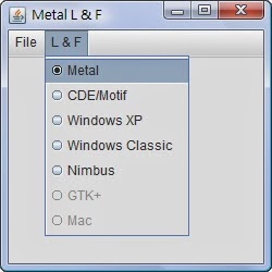 此外可配合選單讓使用者自行選擇,但在執行階段變更Look and Feel,需使用SwingUtilities類別的updateComponentTreeUI()方法,請參考以下範例。範例以選單的方式選擇Look and Feel,待選擇之後,除了以setLookAndFeel()方法設定之外,並需以SwingUtilities類別的updateComponentTreeUI()方法更新:
